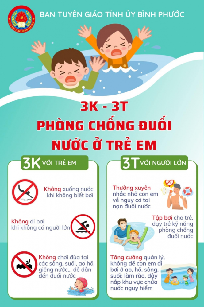- Quản lý chặt chẽ các em trong sinh hoạt, nhắc nhở không để các em tự ý chơi tại các khu vực ao, hồ, sông suối có mực nước lớn, trơn trượt. Không cho các em tự ý đi tắm tại các khu vực không có người lớn trông coi, khu vực ao, hồ, sông suối có mực nước sâu, nguy hiểm.