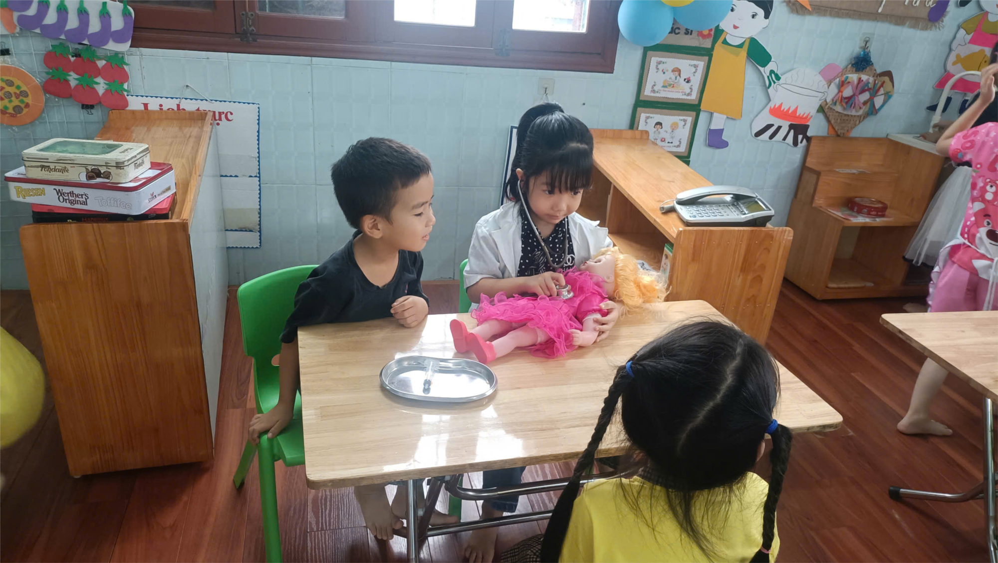 Để các bạn nhỏ hứng thú và có kĩ năng trong khi chơi, cô hướng dẫn bé một cách tỉ mỉ và cụ thể: lời nói, cử chỉ, cách sử dụng dụng cụ để bé hiểu được “bé đóng vai bác sĩ thì phải chơi như thế nào”. Các bé được chơi nhóm bác sĩ thông qua hoạt động góc. Ở đây, bé được hòa mình, nhập vai để được làm bác sĩ. Đồng thời còn giúp bé phát triển ngôn ngữ khi giao tiếp với bạn bè và hiểu biết hơn về công việc của bác sĩ.