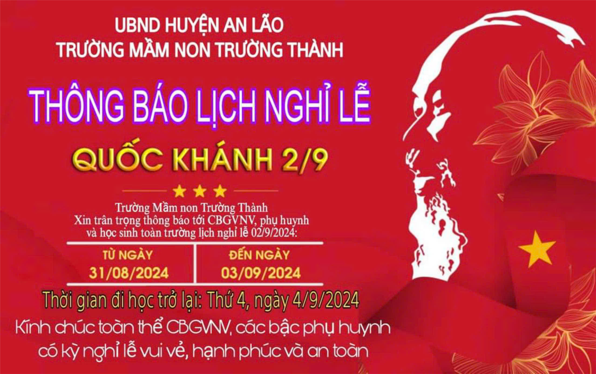 📢 Kính gửi: Quý phụ huynh học sinh Trường mầm non Trường Thành lịch nghỉ lễ Quốc Khánh 02 - 9 - 2024 như sau: