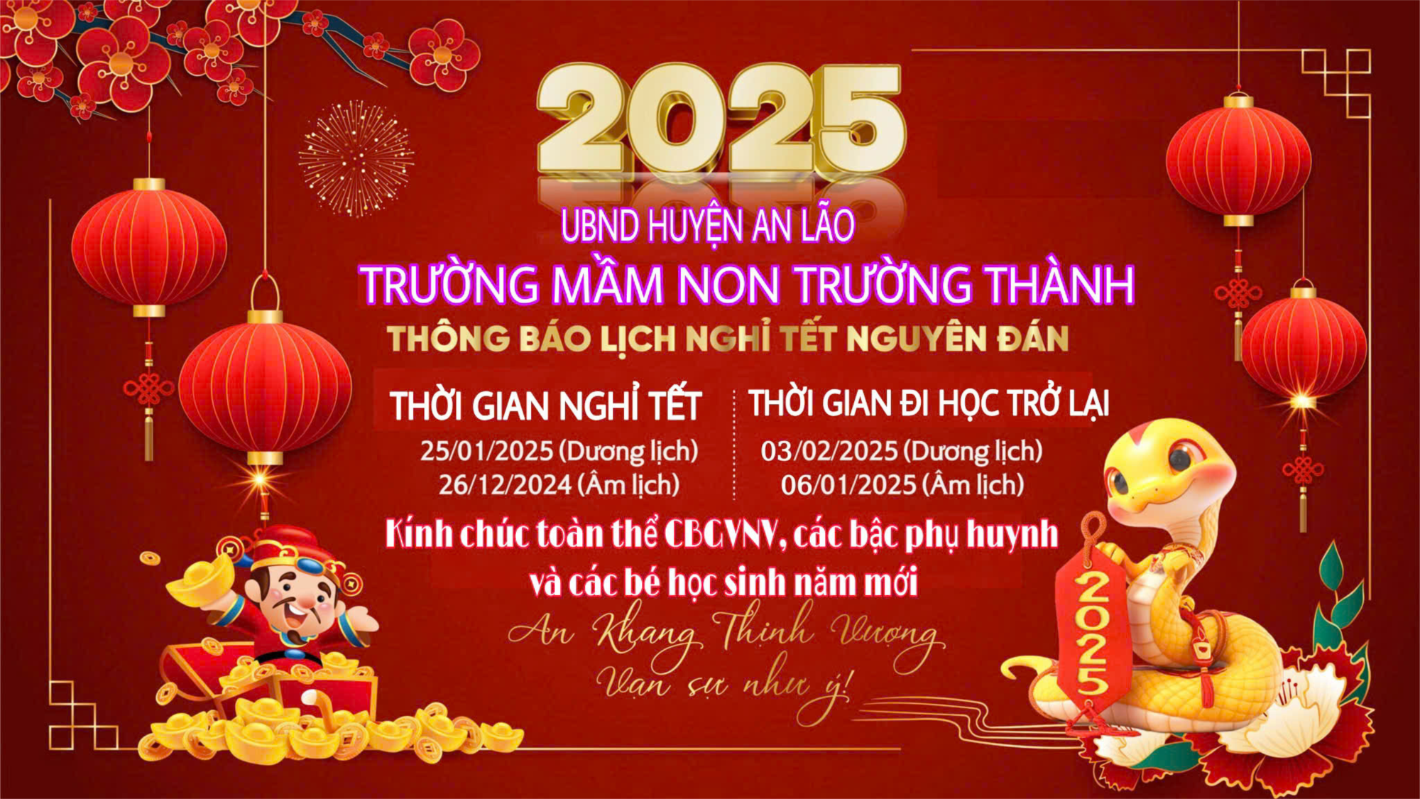 🌸 Kính gửi toàn thể CBGVNV, các bậc phụ huynh và các bé học sinh trường Mầm non Trường Thành lịch nghỉ Tết Nguyên Đán 2025. Nhân dịp năm hết tết đến, kính chúc toàn thể CBGVNV, các bậc PH và các bé có những ngày nghỉ tết vui vẻ, an toàn.