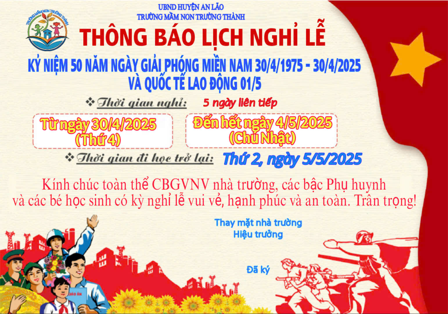 🍀🍀Trường mầm non Trường Thành xin trân trọng thông báo lịch nghỉ lễ 30/4 - 1/5 như sau: