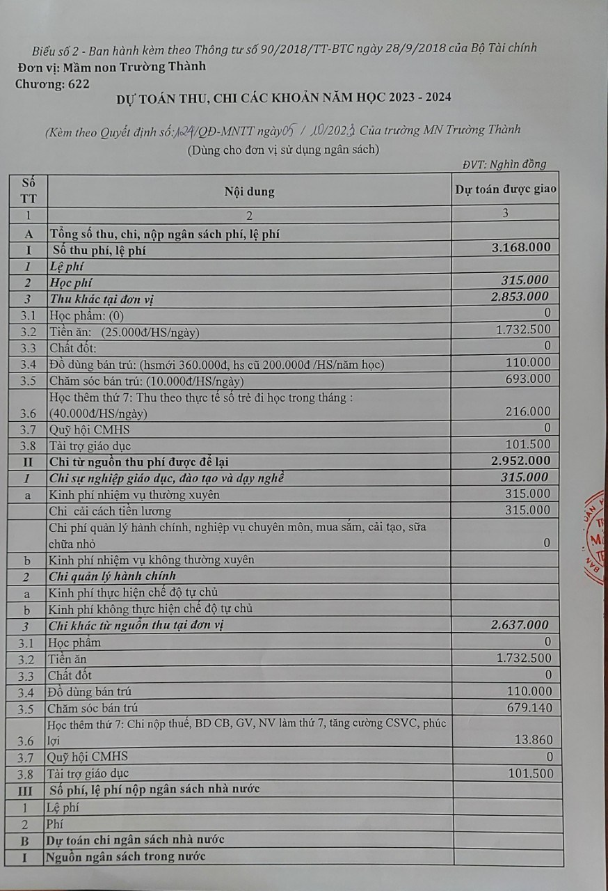 Dự toán thu chi các khoản năm học 2023 - 2024